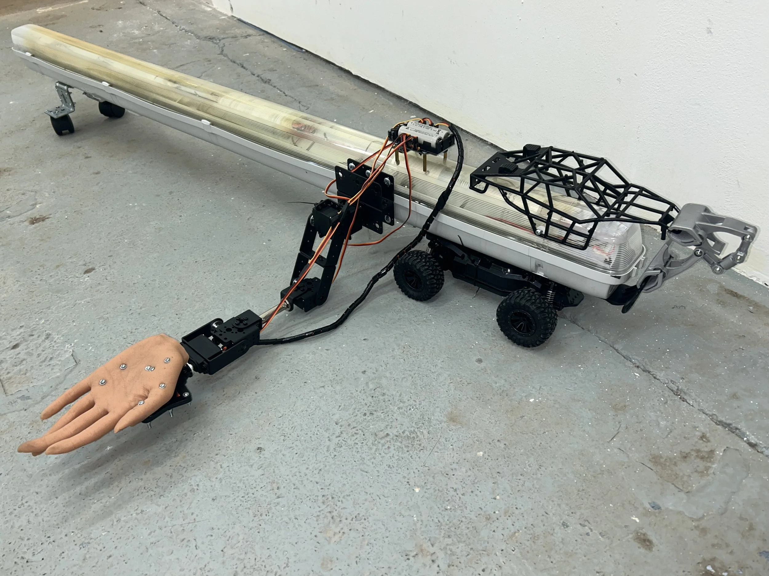 In this live performance, the artist interacts with the audience through a screen positioned in the corner of the gallery, while an anthropomorphic installation—a robotic arm mounted on motorised wheels—moves through the space on his behalf. The device shakes hands, exchanges pleasantries, and performs ritualised gestures of self-introduction, enacting the social behaviours typical of exhibition openings.